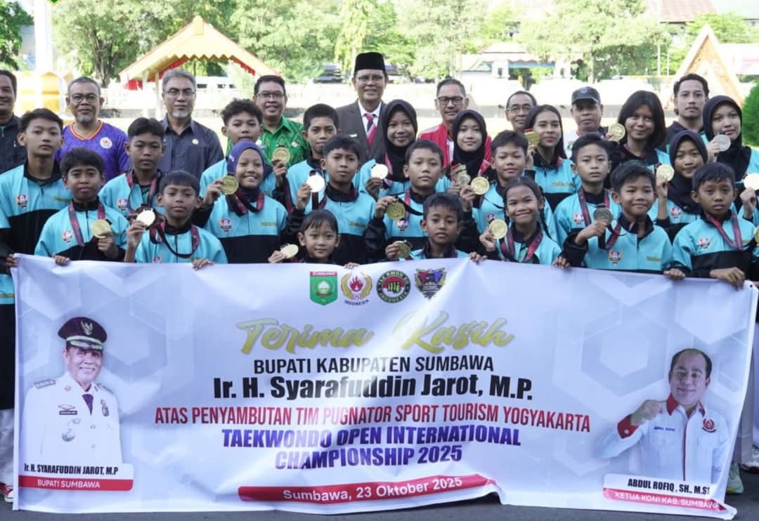 SUMBAWA– Bupati Sumbawa, Ir. H. Syarafuddin Jarot, M.P., menyambut kedatangan para atlet Taekwondo Kabupaten Sumbawa yang baru saja menorehkan prestasi gemilang pada ajang Pugnator Sport Tourism 2025 di Yogyakarta.